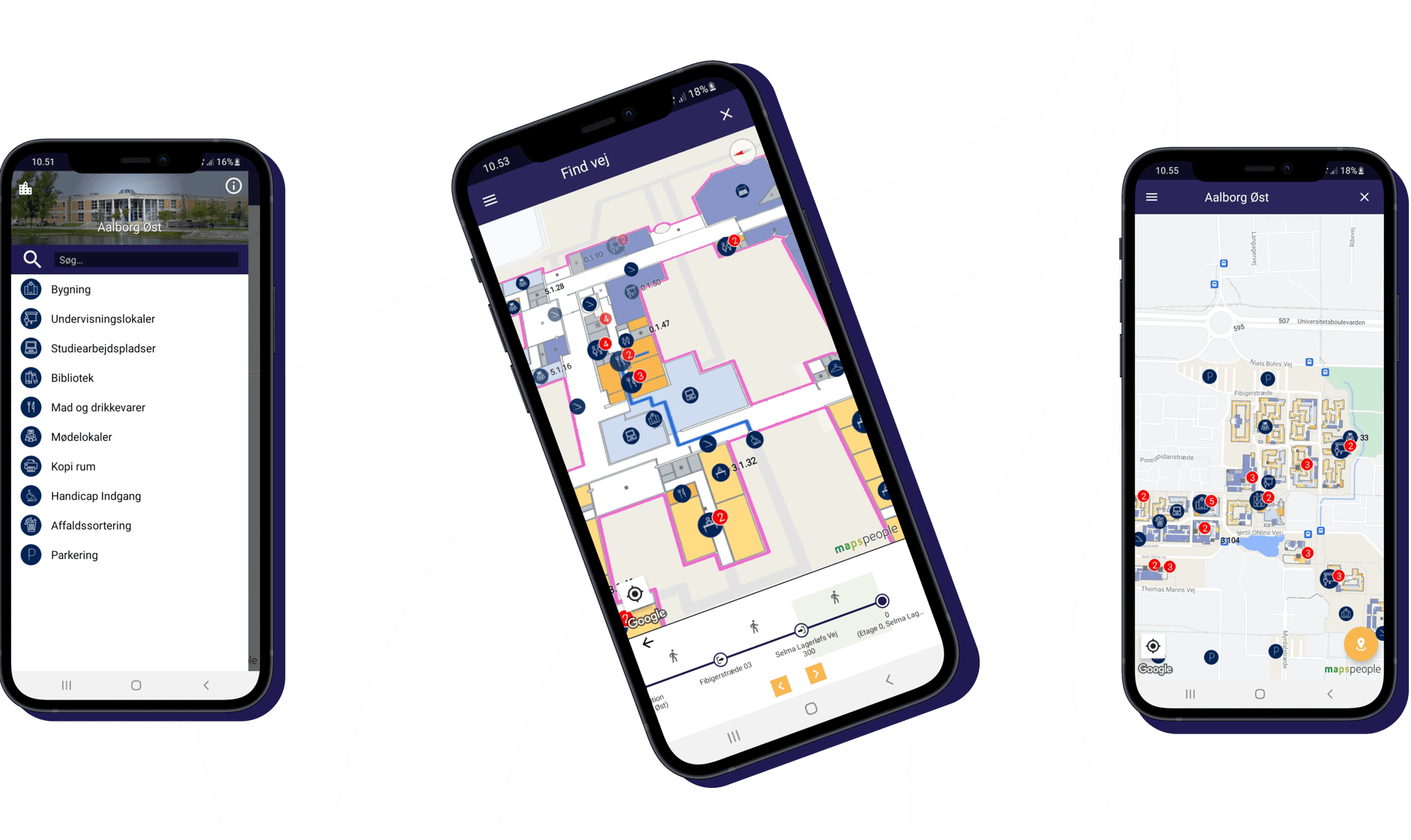 AAU Map works through GPS - just like any other navigation app. You can choose to search for specific addresses or room numbers at AAU, and once you have entered a location, the app will show you the way there – it will even show you which floor you need to go to.