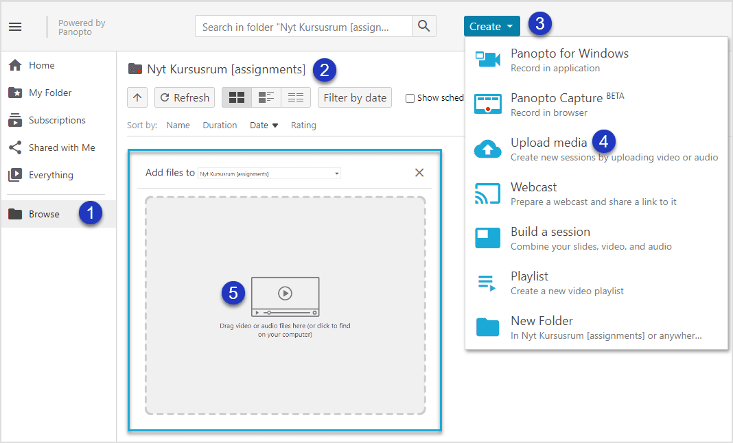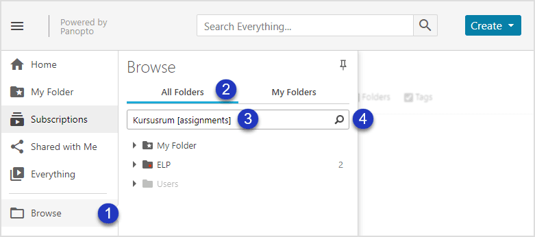 - or search for it under the Browse menu, select All Folders (2) and search (4) on course name [assignments] or course name [assignments] (3)